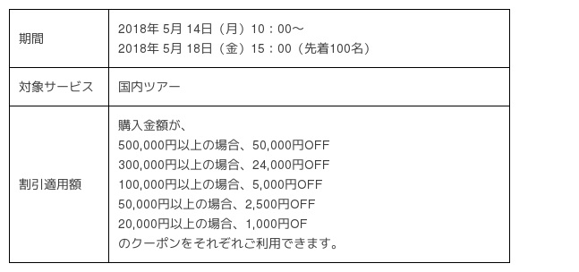 本キャンペーンでは、「バニラエアVパック」の商品を購入時に使える最大50,000円引きクーポンを、5月14日より先着100名様限定で配布します。クーポンは5月14日10:00から18日15:00までの期間に購入した商品で利用可能です。