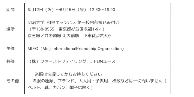 明治大学公認サークル「MIFO(Meiji International Friendship Organization)」は、『全商品リサイクル活動』を6月12日(火)~6月15日(金)12:30~16:00に和泉キャンパスの第一校舎前植込み付近で実施します。
