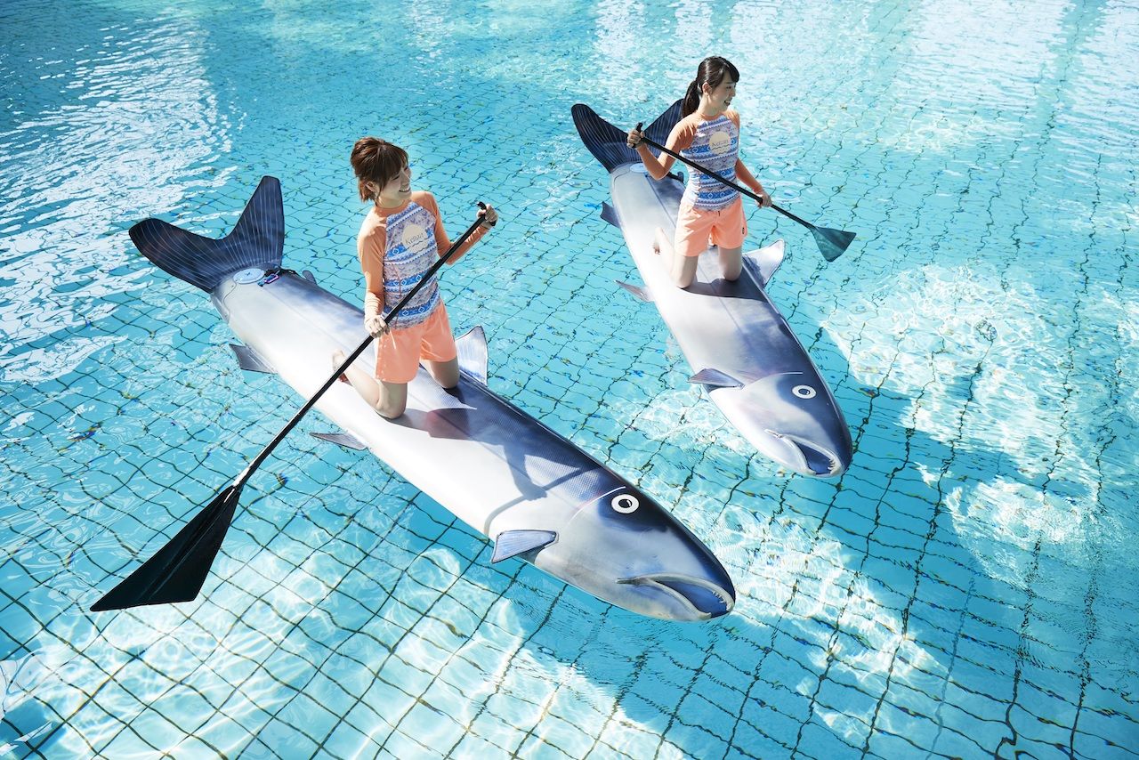 星野リゾート トマム内のインドアウェイブプール「ミナミナビーチ」で、SUPに乗って波を越えていくアクティビティです。ボードには、鮭の姿がデザインされており、パドルには鮭のヒレがデザインされています。まるで鮭の遡上体験をしている感覚を楽しめます。
