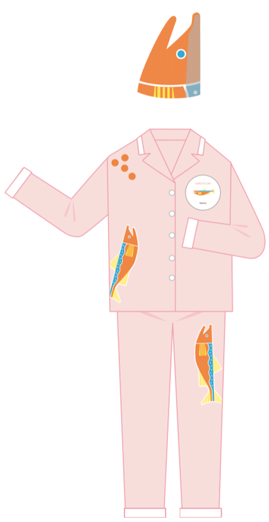 ベッドルームは、川を泳ぐ鮭を表現した空間です。川をイメージした青色の絨毯、鮭の切り身をデザインしたベッドカバーや、鮭のミニクッションなどが設えられています。今年は新たに、川で鮭を狙うクマをイメージしたパネルを壁に設置し、鮭ルーム専用の鮭ナイトキャップと鮭パジャマを加えます。このような空間で過ごすことで、まるで鮭になった感覚を楽しめることも鮭ルームの特徴のひとつです。