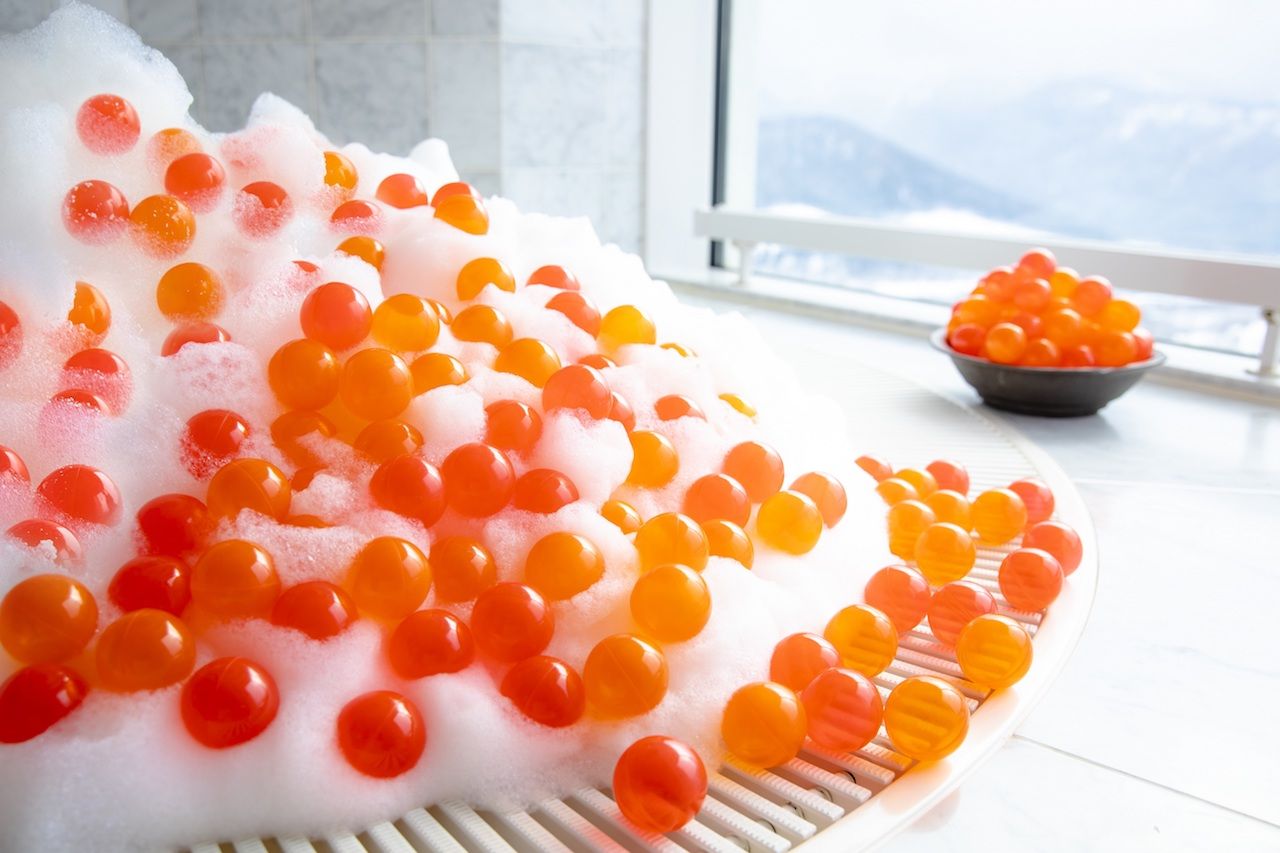 鮭ルーム内にはジェットバスが設置されており、いくら丼をイメージしたお風呂に入れます。用意されたバスボムをお湯に入れると泡が立ち、ご飯のような見た目になります。泡の上にいくらを模した直径5.5センチの「いくらボール」を乗せることで、いくら丼をイメージしたお風呂が完成し、鮭ルームでしかできないバスタイムを堪能できます。