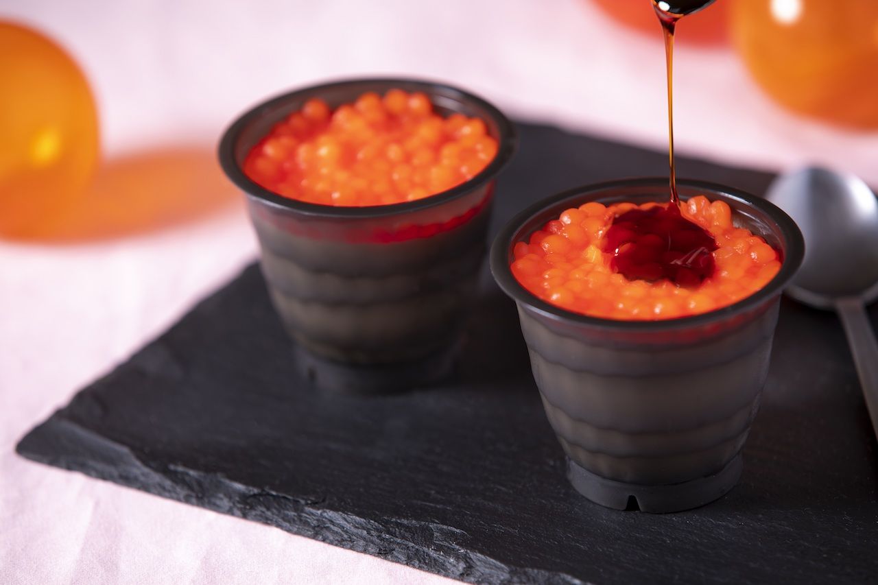 スイーツは、「いくら丼プリン」と名付けられたいくら丼をイメージしたプリンです。濃厚な味わいのプリンに牛乳で炊いたお米が入っており、その上にいくらに見立てたイチゴ味のタピオカが盛り付けられています。さらに、このプリンには醤油の代わりにカラメルソースが付いています。