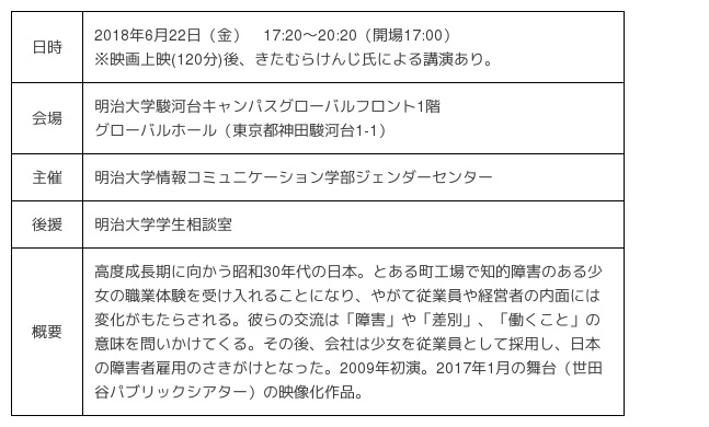 明治大学情報コミュニケーション学部ジェンダーセンターでは、2018年6月22日(金)17:20から、舞台映像『幸福な職場』の上映会を開催いたします。また、上映後には、本作品の制作・演出を行ったきたむらけんじ氏による講演も行われます。申し込み不要・入場無料。映像を通して、わたしたちは障害者雇用を軸に、(旧)優生保護法の適用対象となった障害者の恋愛・結婚をめぐる問題や、障害者の保護者をはじめ、彼らを取り巻く様々な状況、さらには障害者自身にとっての「働くこと」の意義といった多彩な問題をとりあげつつ、ジェンダーやダイバーシティの観点から、社会において「障害」とは何か、「働くこと」とは何かを総合的に考えます。