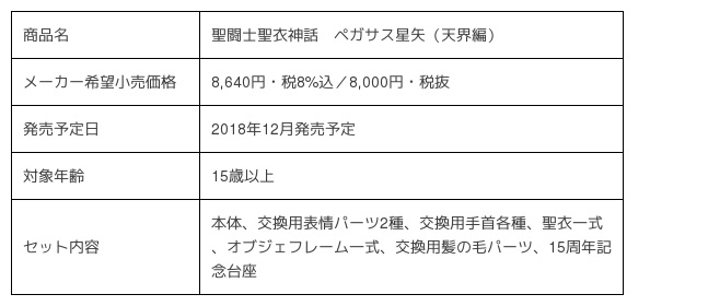 「冥王ハーデス編」の正式な続編として、2004年2月に公開された「聖闘士星矢」シリーズの劇場公開作品第5弾「聖闘士星矢 天界編 序奏〜overture〜」に登場した主人公・星矢の聖衣を、聖闘士聖衣神話15周年を記念して初商品化します。また、オブジェ形態は劇中では未登場のため今回新規にデザインされたものです。