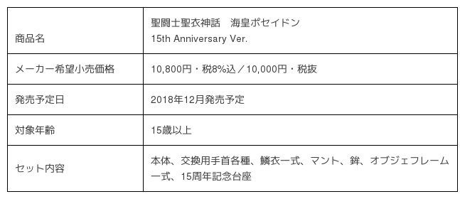 2018年10月 15周年記念アイテム聖闘士聖衣神話「女神アテナ 15th Anniversary Ver.」「冥王ハーデス 15th Anniversary Ver.」「海皇ポセイドン 15th Anniversary Ver.」「ペガサス星矢(天界編)」を順次発売