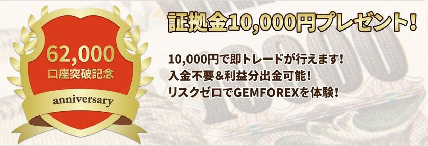 GEM-TRADE Co.,Ltd (office:Road Central Hong Kong、代表取締役CEO:Keith Fitzwilliam、以下 当社)は、2018年6月18日から同6月24日までの7日間、GEMFOREXにおいて無料モニター登録(新規口座開設)をいただいたお客様全員に証拠金10,000円を口座にプレゼントする「62,000口座突破記念!新規口座開設キャンペーン」を開催いたします。