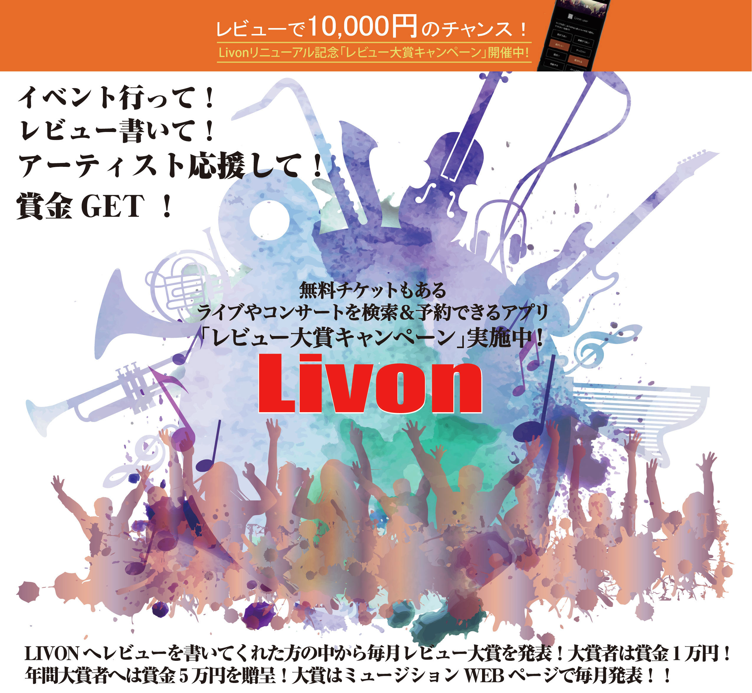 株式会社リブラン(本社:東京都板橋区、代表取締役:鈴木 雄二)は、「音楽(生音)をもっと楽しむ文化を創りたい」という想いから、利用者の好みにマッチしたライブやコンサートの検索やチケット購入が気軽にできるアプリ「Livon(ライボン)」を開発し、2016年5月末に大幅なリニューアルをいたしました。選択できる「好み」の設定を多様化したことで、より利用者の好みにマッチしたライブやコンサートの情報提供が行えるようになりました。そのリニューアルを記念して、「Livonレビュー大賞キャンペーン」を行うことを発表いたします。
